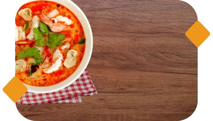 A Thai-inspired hot and sour soup with a hint of spice, fresh herbs, and egg, offering a perfect balance of tangy and aromatic flavors.